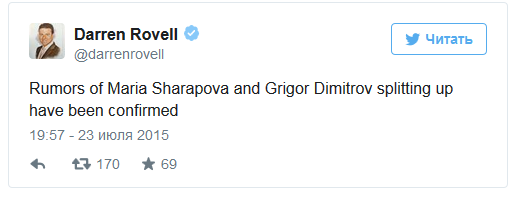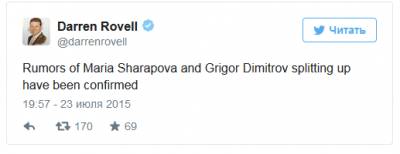 Вторая ракетка мира Мария Шарапова и болгарский теннисист Григор Димитров расстались. Об этом в своем официальном микроблоге в Twitter написал американский журналист телеканала ESPN Даррен Ровелл.