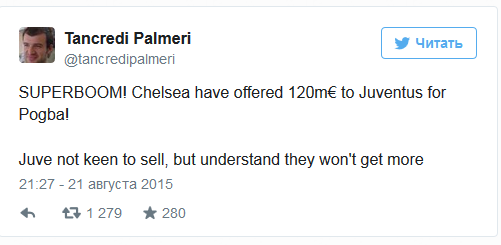 | СМИ: «Челси» предложил за игрока «Ювентуса» Погба €120 млн «Челси» предложил за полузащитника «Ювентуса» Поля Погба €120 млн, сообщил в своем твиттере журналист BeIN Sports Танкреди Палмери.