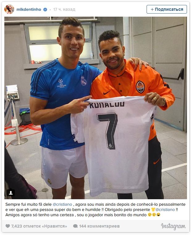 Бразильский полузащитник Шахтера Дентиньо получил футболку Криштиану Роналду, в которой тот забивал голы в ворота “горняков“. Об этом сообщил сам футболист, разместив фотофакт на своей странице в одной из социальных сетей.