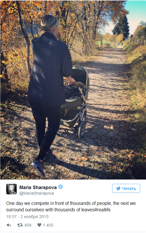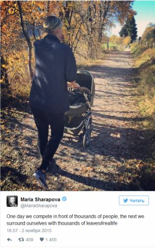 Российская теннисистка Мария Шарапова выложила в микроблоге в Twitter свою фотографию с детской коляской, но не уточнила, чей ребенок там находится.